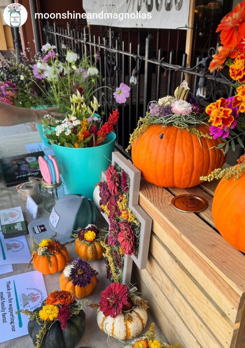 Dried Flowers: As the first frost draws near, we are continuing to create products featuring our dried flowers. We are so excited to share our Bloom Hoops and Dried Flower Pumpkins with you! Both feature our dried flowers and are lovely additions to decorate your home for the Fall season and beyond! This past weekend, we had a pop-up shop at Moonshine & Magnolias in Hendersonville, and they were a hit! If you don’t see them at our farm stand, contact us directly to place an order.